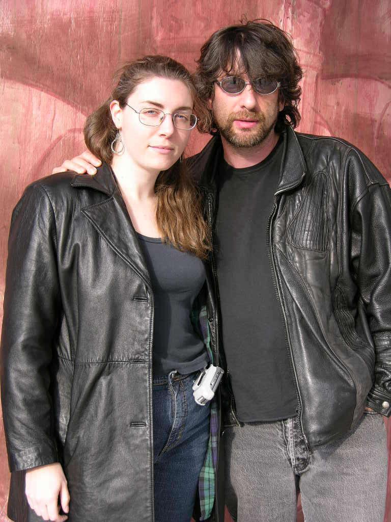 http://www.netmouse.com/me/images/neil_anne_chicago.jpg is one of my favorite photos of me, despite the weird thing going on with my hair. Back when I was still wearing my trademark plaid sometimes (I always/really really often wore the plaid flannell that’s peeking out from under the leather jacket throughout high school and college). This picture was taken on the streets of Chicago by someone in the group who went to lunch with Neil. I believe that was the weekend of the Nebulas where Neil was toastmaster/MC and I was his liaison to the committee. I was trying to match the serious/yet pleasant/not quite a smile Neil almost always uses when posing for pictures so it wouldn’t be me grinning and him serious. I really like the lighting.