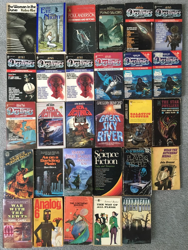 Today's batch: Kōbō Abe through Karel Capek. A third of this batch are issues of Destinies, the “paperback magazine” that Jim Baen edited in the '70s and '80s (but this is not a complete set of that series).