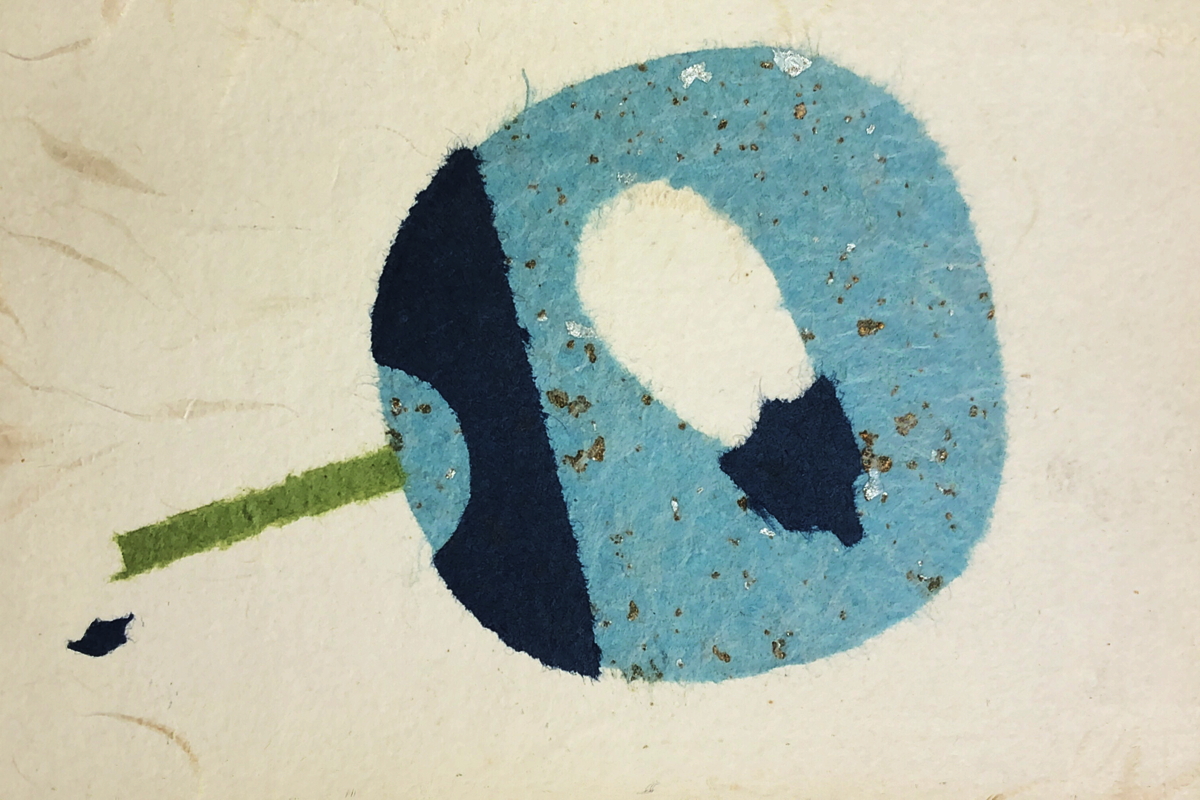 Another postcard. The art on the front was apparently made by gluing on torn bits of construction paper. KTO explained to me that it’s Chigiri-e, Japanese torn-paper art, and that it portrays an uchiwa (paper fan) with a picture of a white eggplant on it.
