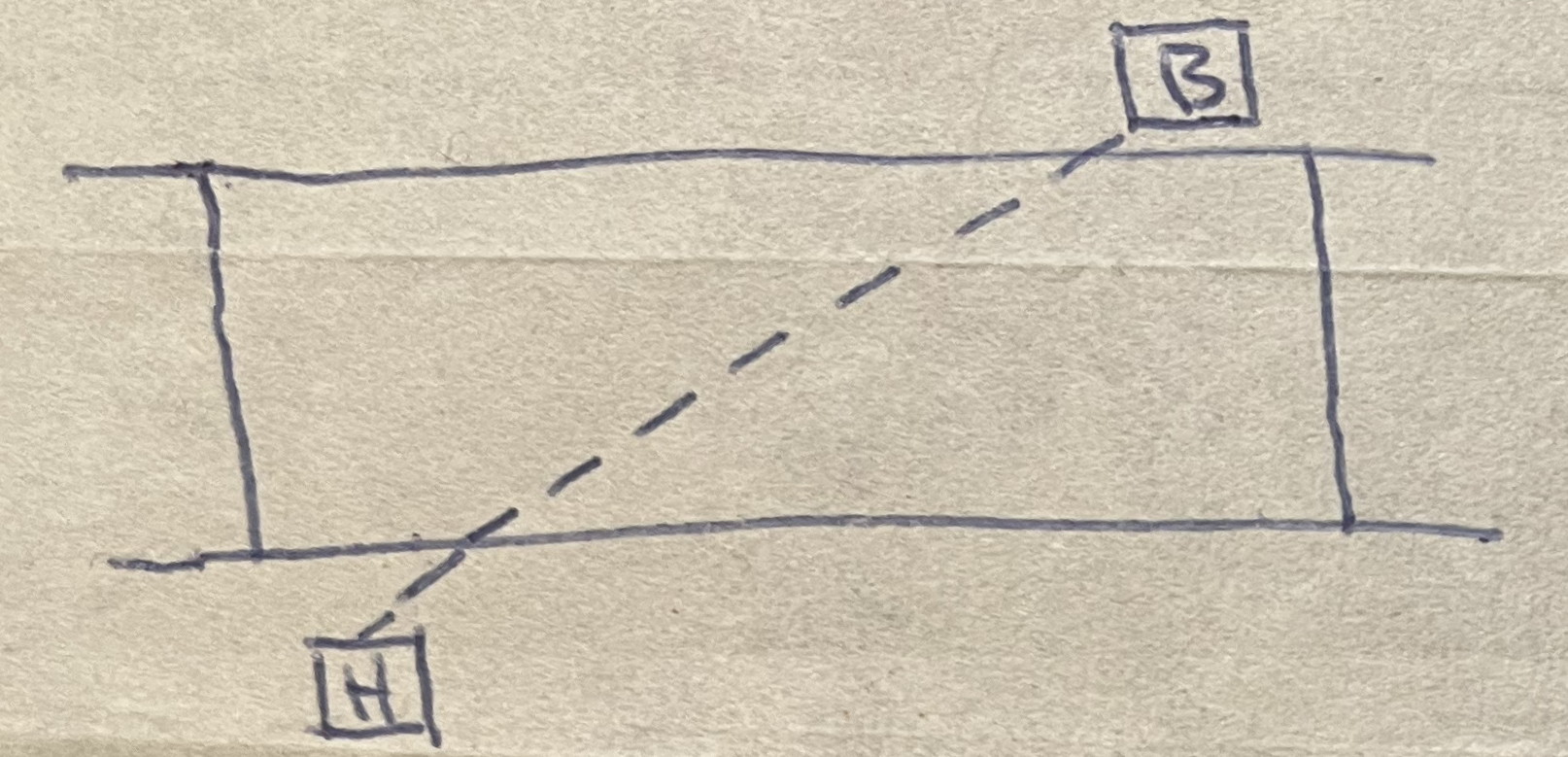 o, here’s a neat one: a lame farmer wants to build a bridge from house H to barn B, across river R, such that the edges of the bridge are square (⟂) to the river’s edges: