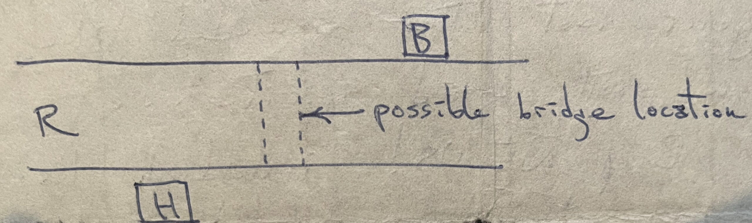 Diagram for bridge puzzle, showing H and B on opposite sides of river R, with some distance between them along the riverbank, and a possible bridge location between them.