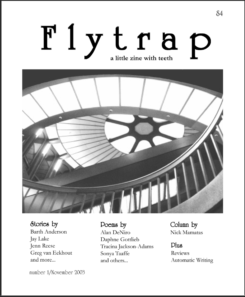 Issue 1 of Flytrap debuted in October 2003 at the World Fantasy convention. (Click the cover for a larger version of the image.) Stories: "Scrapbook for an Epidemic" by Barth Anderson "Rain" by Gabriel Edson "Ladybug Summer" by Susan Marie Groppi "Carving" by Derek James "Never, Inc." by Michael J. Jasper "Like Cherries in the Dark" by Jay Lake "Sifting in the Dust" by Jen Larsen "Spidergirl", Jenn Reese "She Is Elizabeth Lynn Rhodea" by Karina Sumner-Smith "Fishing, I Go Among Them" by Greg van Eekhout (And, perhaps, additional fiction-like things by special guests and hubristic squatters) Poems: "Indestructible" and "Wolf, with Saint" by Alan DeNiro "boring things the living do" by Daphne Gottlieb "The Elder Daughter's Tale" by Tracina Jackson-Adams "Make Your One Night Stand Last Forever with Voodoo" by Jen Larsen "New Blood" by Sonya Taaffe "Desire" by Maria Garcia Tabor "Volvo to the Beach" by Jay Wentworth Nonfiction: Life Among the Obliterati, a column by Nick Mamatas Reviews by Tim Pratt & Heather Shaw Automatic Writing