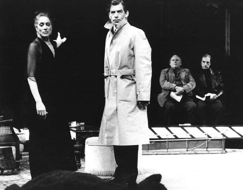 There are clips, of course. There’s a compilation of Newman Noggs scenes from NickNick. Here’s a clip from Krapp’s Last Tape that shows much of the same inventiveness and control used to a very different purpose. Here’s a… thing of some kind and here’s another. I rather like this bit of a lecture on undulation, too. For no good reason, here’s a photograph of him as Volpone. And what the hell, a photograph of him in the background sitting next to Rory Kinnear, with Ian McKellen and Eleanor Bron in the foreground of The Real Inspector Hound, put on by what was called the McKellen/Petherbridge group of the National Theatre. That must have been a thing, hm?