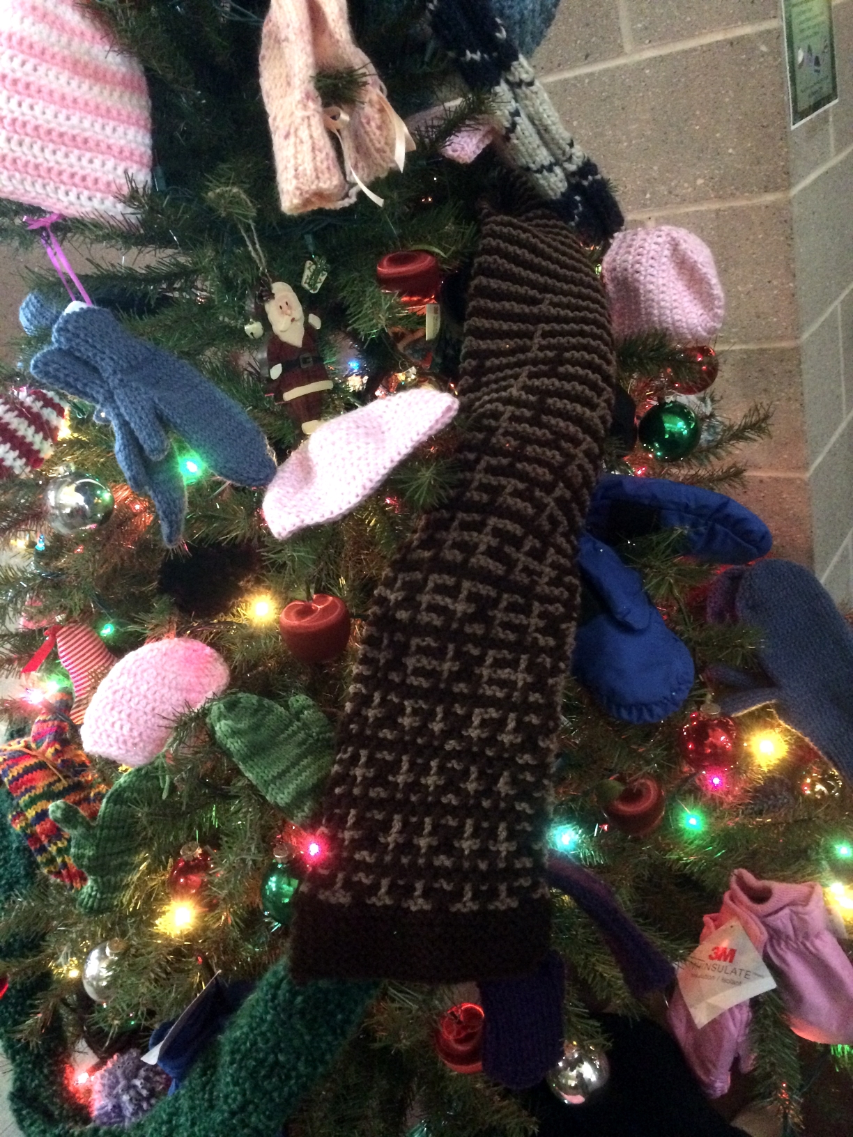 It’s (perhaps obviously) draped around our Mitten Tree, put up annually by the library that employs me for donations to local shelters of gloves and hats and so forth. I don’t knit much, but most of what I do knit winds up there. In addition to the brown-striped scarf, this year’s scarves are the green scarf on the bottom and the blue-and-cream one you can see a bit of on the top. I already gave away one scarf that I made this year, too. I think that may be my entire output for the year, not counting the first attempt at mosaic knitting described back in March or the thing I started and then ripped out over the Thanksgiving weekend.